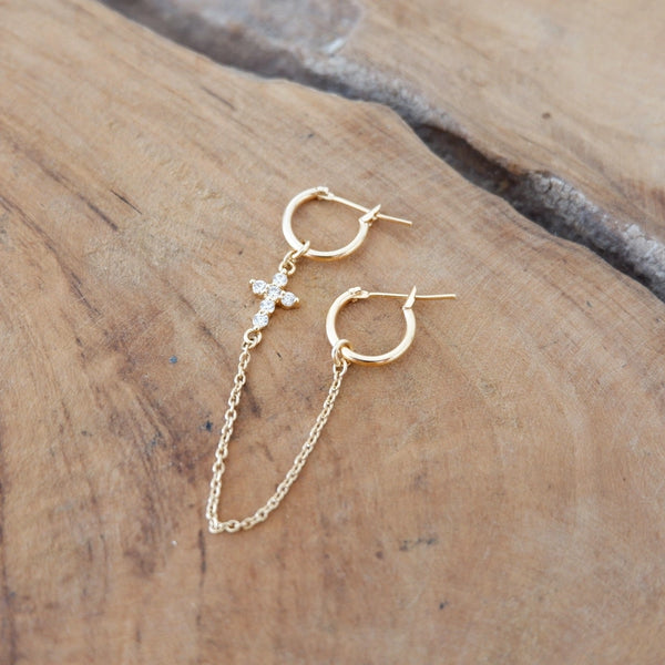 La boucle d’oreille Léa est un bijou raffiné et original. Vendue à l’unité, elle se compose d’une créole en plaqué or ornée d’une petite croix pavée de zircons reliée à une chaînette délicate.