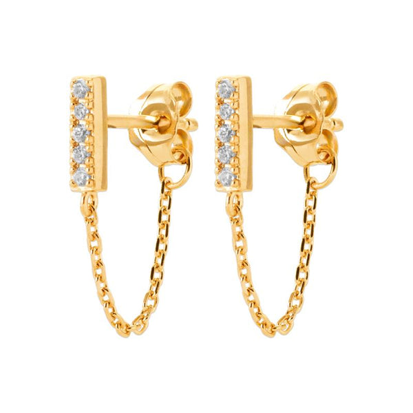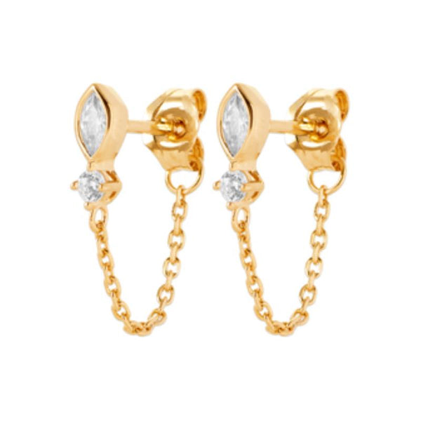 Les boucles d’oreilles Olympe en plaqué or se déclinent en deux versions élégantes reliées par une fine chaîne : l’une ornée d’un motif géométrique serti de zircons, l’autre sublimée par des pierres taillées en forme de goutte. Leur design raffiné mêle délicatesse et modernité.